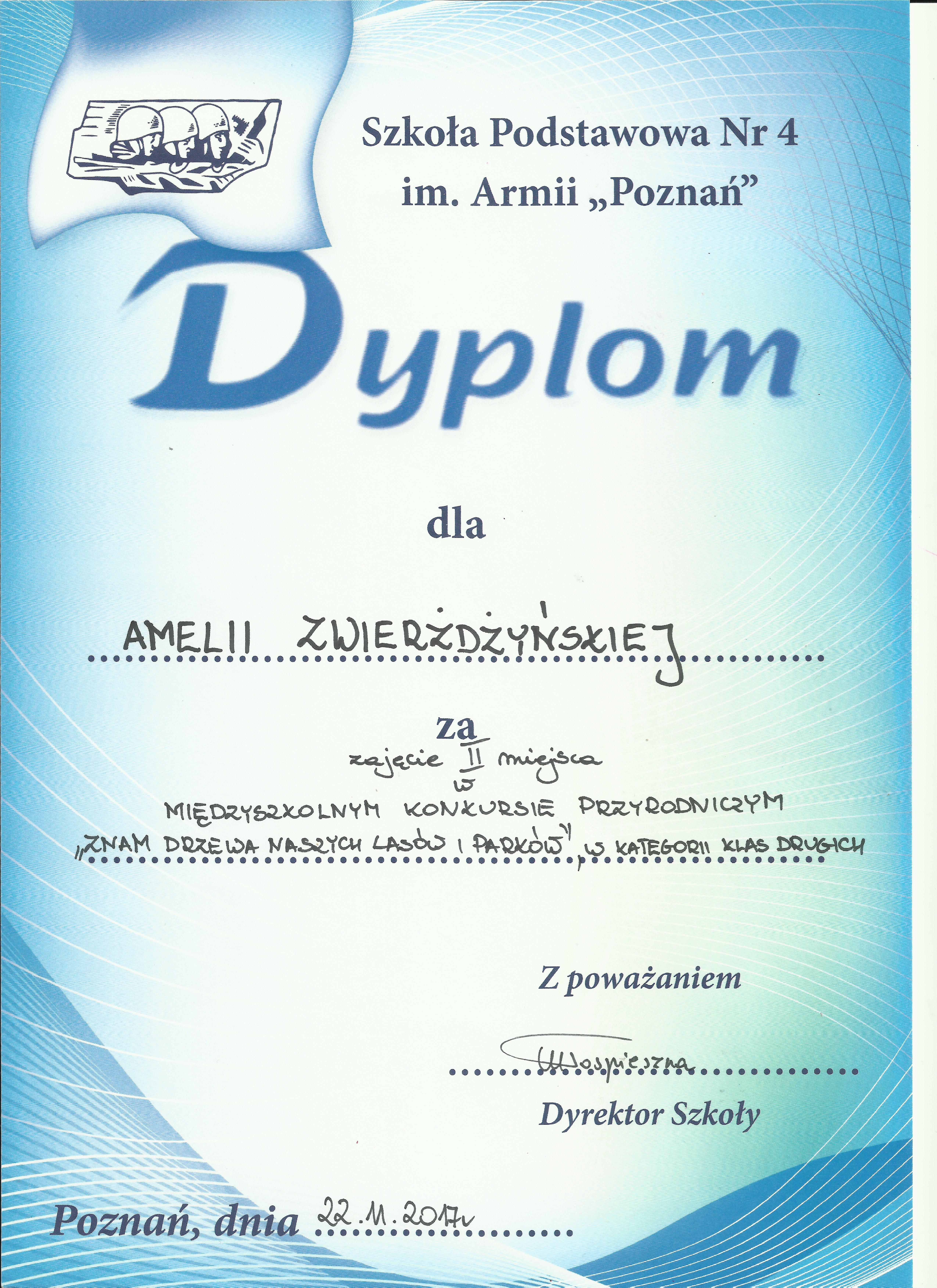 2 b, Amelia Zwierżdżyńska, reprezentowała klasy drugie w Międzyszkolnym Konkursie Przyrodniczym – „Znam i rozpoznaję drzewa naszych parków i lasów” zorganizowanym przez Szkołę Podstawowa nr 4 w Poznaniu. Nasza uczennica pokonała konkurentów z wielu szkół poznańskich i na poziomie klas drugich zajęła II miejsce.