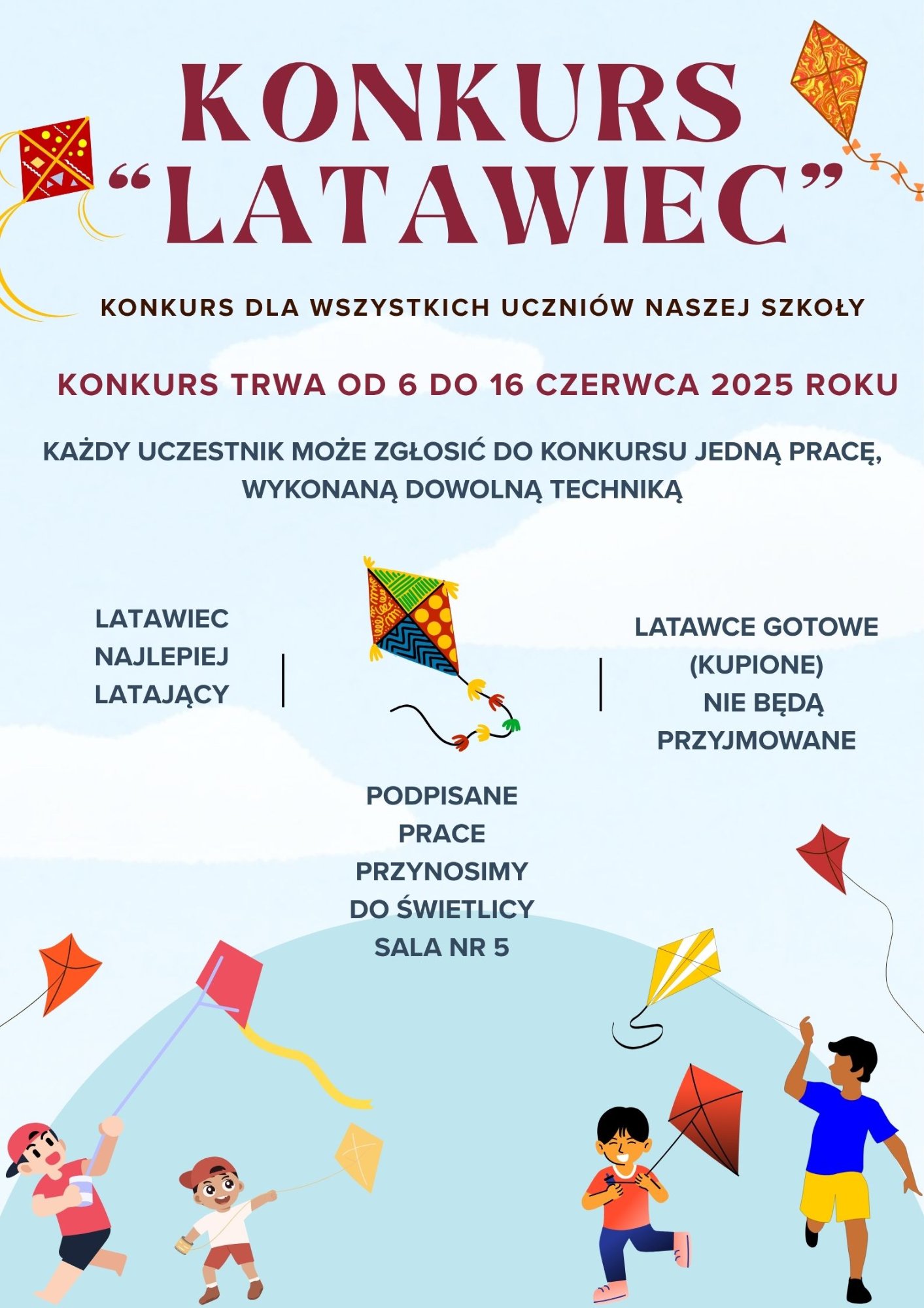 Pracę należy dostarczyć do świetlicy (sala nr 5) najpóźniej do dnia 16 czerwca 2025 roku (poniedziałek).