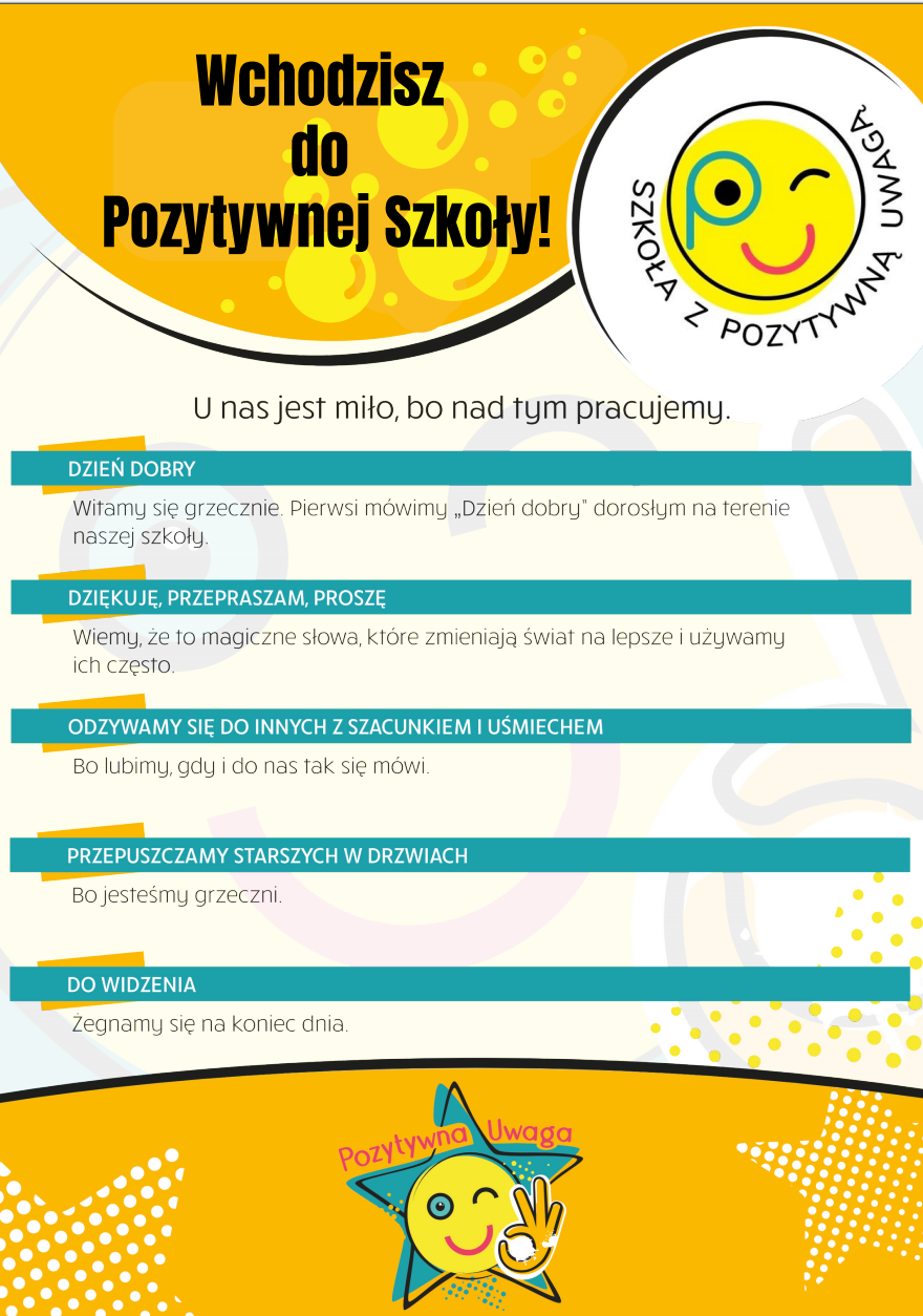 Nasza szkoła bierze udział w akcji Pozytywna Uwaga. W związku z tym podczas wszystkich lekcji promujemy wśród dzieci życzliwość i pozytywne zachowania, np. poprzez głośne zauważanie przejawów kultury osobistej lub wpisywanie pozytywnych uwag do mobidziennika. Zachęcamy ich do działania.