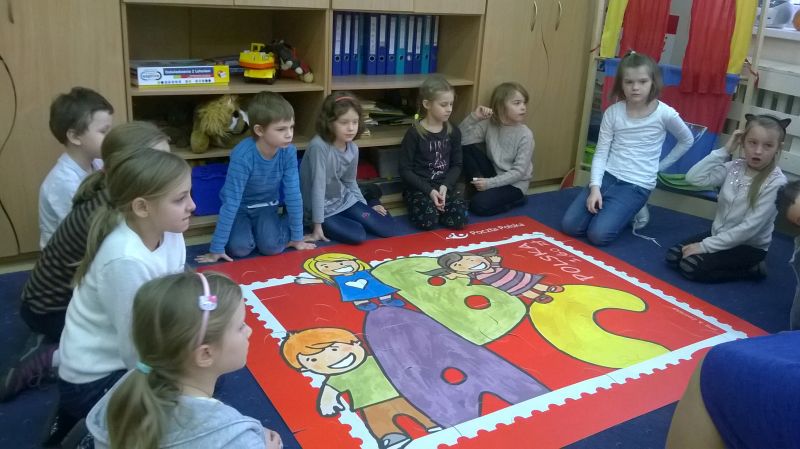 We wtorek, 28.11. klasy – 1a, 1b, 2b i 4a uczestniczyły w bardzo ciekawych warsztatach filatelistycznych. Do naszej szkoły przyjechała bowiem Pani, przedstawicielka Poczty Polskiej, aby w ciekawy sposób opowiedzieć uczniom o znaczkach. W krótkiej pogawędce przypomniała, w jaki sposób adresujemy listy, po co na kopercie przyklejamy znaczek i po co udajemy się na pocztę. Ponadto dzieci poznały historię znaczka pocztowego na świecie i w Polsce. Mogły obejrzeć pierwszy znaczek, który został wydany w Anglii w 1846 roku i przedstawiał Królową Wiktorię. Uczniowie podziwiali również wiele innych ciekawych znaczków zgromadzonych w klaserach. Podczas zabawy, ułożyli wielki znaczek z puzzli. Na koniec dzieci same projektowały swoje znaczki, a w nagrodę otrzymały okolicznościowe koperty i karty pocztowe.