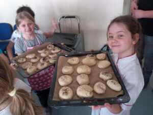 W ubiegłym tygodniu klasy II a i II b wzięły udział w warsztatach kulinarnych organizowanych przez Akademię Umiejętności i Smaku „Kulinarne Przygody”. Podczas zajęć dzieci wypiekały samodzielnie przyrządzone bułeczki, przygotowały zdrową Nutellę oraz pożywną pastę słonecznikową.